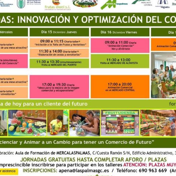 Otro año más dan comienzo las Jornadas de Innovación y Optimización del Comercio, que este año tienen como objetivo “Concienciar y animar a un cambio para tener un comercio de futuro” Las jornadas comenzarán este miércoles 14 de diciembre y finalizarán el sábado día 17 de diciembre. Ponente: Dionisio Horrillo. www.frutasdioni.com Lugar de celebración: Aula de formación Mercalaspalmas. Jornadas gratuitas hasta completar aforo. Inscripciones: apena@laspalmas.es Teléfono: 690 963 669 Día 14 de Diciembre: 9:00 a 11:15 Charla Taller. “Troceados, zumos y presentación de una mesa atractiva” 9:30 a 11:30 Charla (simultanea). “Innovación y optimización del comercio” 15:00 a 17:30 Charla taller. “Troceados, zumos y presentación de una mesa atractiva” Día 15 de Diciembre: 9:00 a 11:15 Charla Taller. “Iniciación a la talla de frutas y hortalizas” 11:30 a 14:00 Charla Taller. “Elaboración y cestas de envoltorios” 11:30 a 13:30 (simultáneamente) Vista al Mercado del Puerto. 17:00 a 19:30 Charla. “Ideas para la mejora del imagen comercial y escaparatismo” Día 16 de Diciembre. 9:00 a 11:00 Charla. “Animación comercial” Ven y diviértete. 11:30 a 13:00 Visita al Mercado de Altavista. 17:00 a 20:00 Animación comercial en el Mercado Central. Día 17 de diciembre 9:00 a 13:00 Animación comercial en el Mercado de Vegueta.